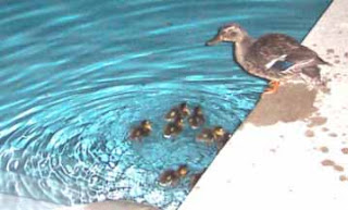 Went out back to smoke and discovered a mother duck and her babies have moved into Brandee and Matt's swimming pool: